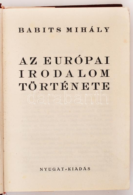 Babits Mihály: Az európai irodalom története. Bp., [1934], Nyugat. Vás... https://www.darabanth.com/hu/237-Gyorsarveres/237.0/Festmeny-mutargy-papirregiseg-egyeb/Konyvek-Egyeb-ritkasagok~200043/Babits-Mihaly-Az-europai-irodalom-tortenete-Bp-1934-Nyugat-Vaszonkotesben-az-eloze~II1097021