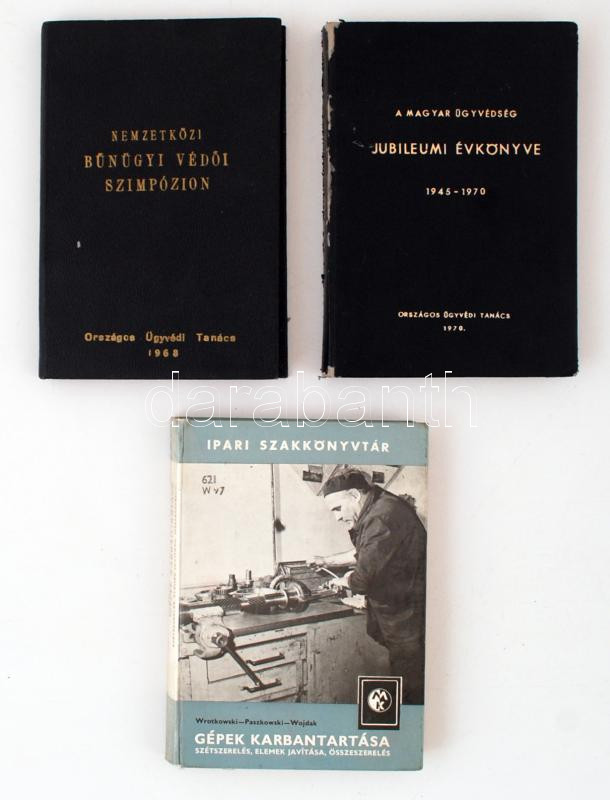 3 db vegyes témájú könyv-A magyar üdvégység jubileumi évkönyve 1945-1970. Vác, 1970, Országos Ügyvédi Tanács; Nemzetközi bűnügyi védői szimpózion. Bp., 1968, Országos Ügyvédi Tanác; Wratkowski-Paszkowski-Wojdak: Gépek karbantartása. Bp., 1979, Műszaki Könyvkiadó. Kiadói műbőr és kartonált kötés, kötetenként változó állapotban.