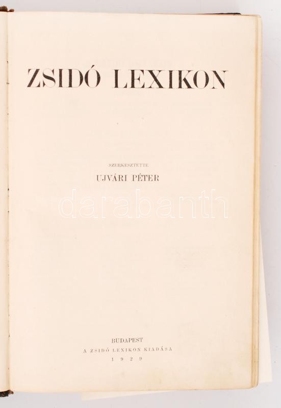 Leírás: Újvári Péter(szerk.): Zsidó Lexikon. Bp., 1929, Zsidó Lexikon Kiadása. Kiadói aranyozott gerincű félbőr kötés, kissé kopottas állapotban.