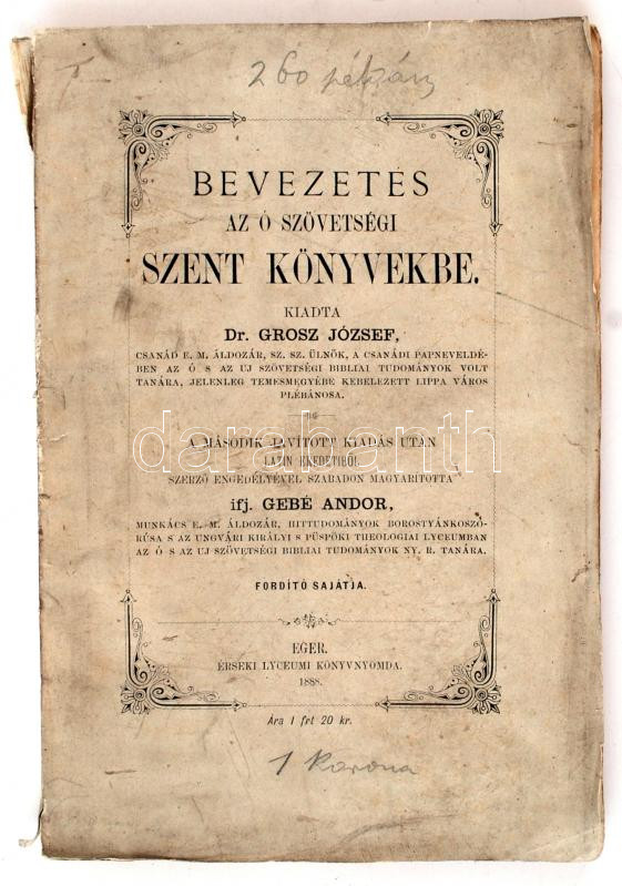 Bevezetés az Ó Szövetségi Szent Könyvekbe. Kiadta: dr. Grosz József. Eger, 1888, Érseki Lyceumi Könyvnyomda. Kissé viseltes kiadói papír kötésben. Felvágatlan példány.