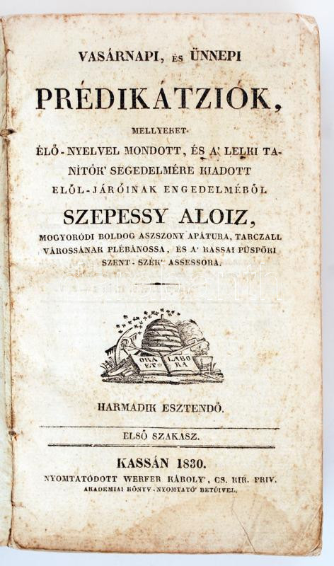 Szepessy Aloiz: Vasárnapi, és ünnepi prédikátziók, mellyeket élő-nyelvel mondott, és a' lelki tanítók' segedelmére kiadott elöljáróinak engedelméből - - Harmadik esztendő. I-IV szakasz. Kassán, 1830, Werfer Károly. Erősen kopott karton kötésben.