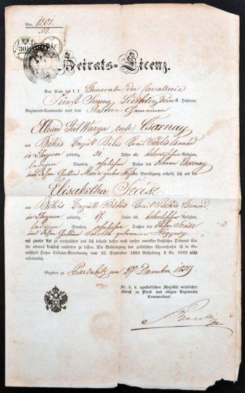 Leírás: 1859 Heirats-Licenz, német nyelvű házassági engedély katonaszemély részére