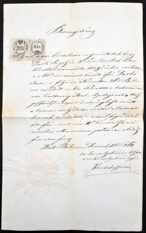 Leírás: 1869 Békés, magyar nyelvű katonai alkalmatlansági bizonyítvány, rányomott szárazpecséttel