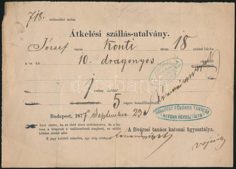 Leírás: 1877 Bp., A fővárosi tanács katonai ügyosztálya által kiállított átkelési szállásutalvány 10 dragonyos elszállásolásáról