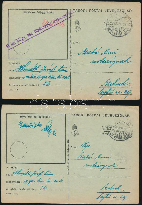 1940-1944 Horváth József törzsőrmester levelezése, feleségének címzett 40 bdb tábori postai levelezőlap és 1 db levélboríték, többségükön "gépvontatású tarackos üteg" bélyegzéssel, többféle postabélyegzővel