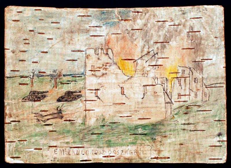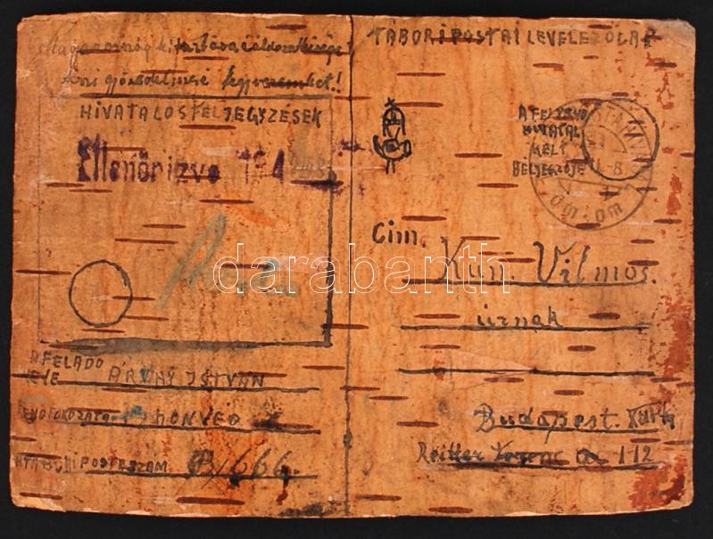 1944 Rajzos, nyírfakéregre készített levelezőlap Őrszőrszagból magyar ... https://www.darabanth.com/hu/237-Gyorsarveres/237.0/Festmeny-mutargy-papirregiseg-egyeb/Militaria~200033/1944-Rajzos-nyirfakeregre-keszitett-levelezolap-Orszorszagbol-magyar-katona-altal-hazakul~II1094404