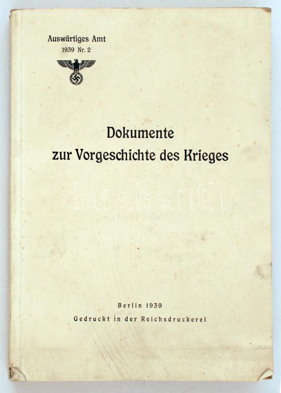 Dokumente zur Vorgeschichte des Krieges. Berlin, 1939. 488p. Jó állapo... https://www.darabanth.com/hu/237-Gyorsarveres/237.0/Festmeny-mutargy-papirregiseg-egyeb/Militaria~200033/Dokumente-zur-Vorgeschichte-des-Krieges-Berlin-1939-488p-Jo-allapotu-papirkotesben-papir~II1098219