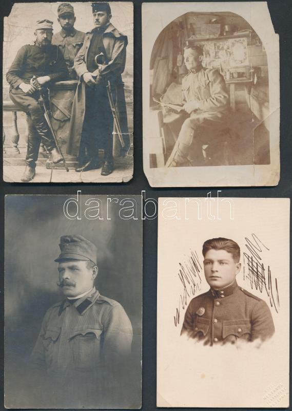 Leírás: cca 1916-1940 13 db katonai fotó, egy részük hátulján feliratozva, különböző méretben és állapotban