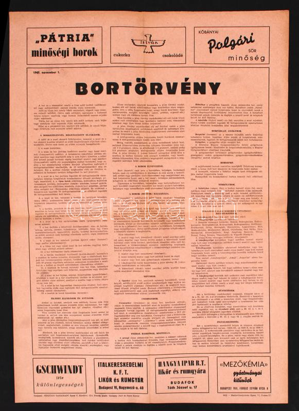 1947 A bortörvényt ismertető nagyméretű plakát, rajta szeszes italt gyártó cégek reklámjaival(Pátria, Kőbányai Polgári Sör, Gschwindt, Hangya Ipar Rt.), 59x42 cm