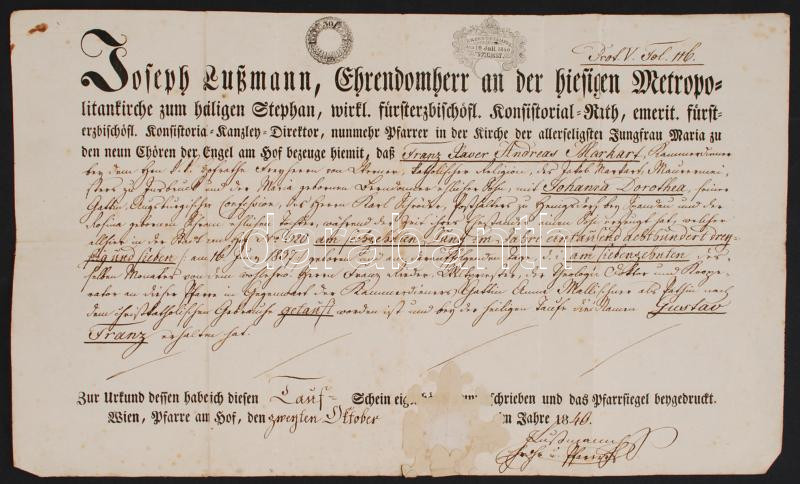 Leírás: 1840 Keresztlevél a bécsi Szent István templomból 30kr szignettával / Certificate for baptism from Wienna St Stephen curch, with signetta