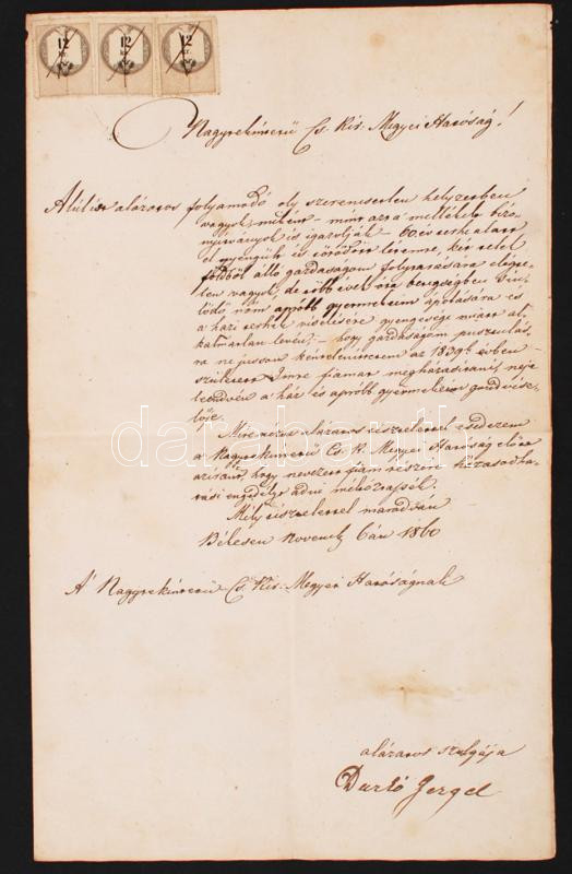 Leírás: 1860 Magyar nyelvű kérvény a Békés vármegyei hatóságnak házasodhatás tárgyában, 3×12 kr okmánybélyeggel, hátoldalán rávezetve a végzés