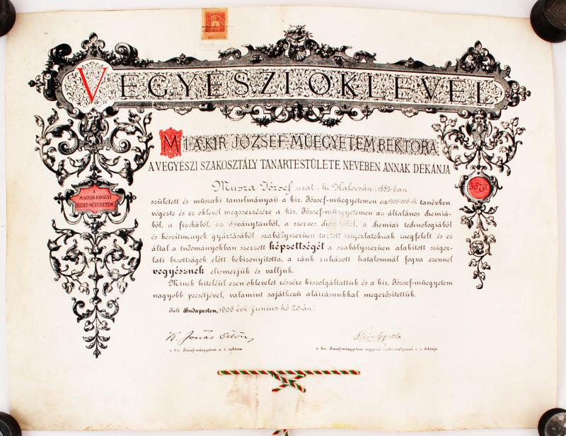 Leírás: 1906 Vegyészmérnöki (Magyar Királyi Műegyetem) diploma, pecsét fedő hiányzik, eredeti tokjában (sérült)