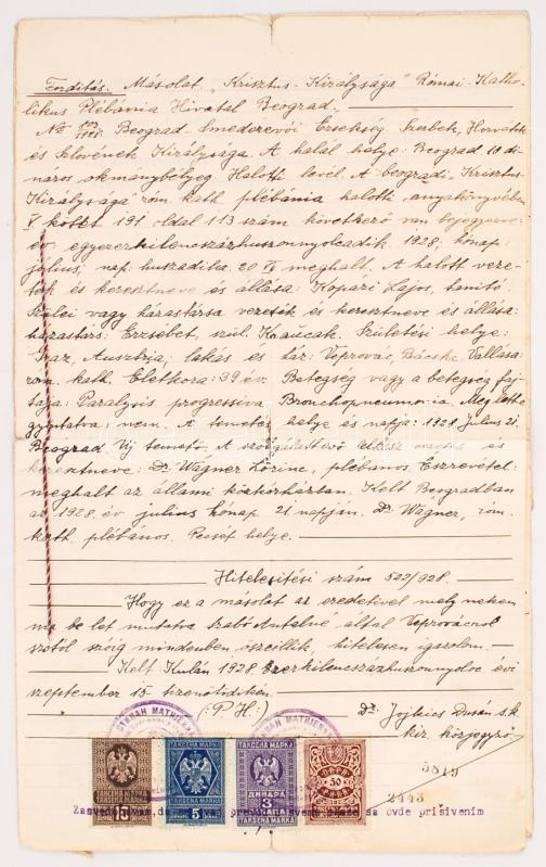 Leírás: 1928 Halotti anyakönyvi jegyzőkönyv rajta 4 db horvát okmánybélyeggel