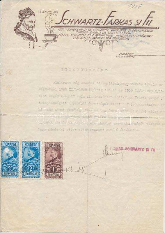 Leírás: 1928 Nagyvárad(Oradea), Schwartz Farkas Fűszer Cseme és Gyarmatárú Nagykereskedők által kiadott munkáltatói igazolás román okmánybélyegekkel