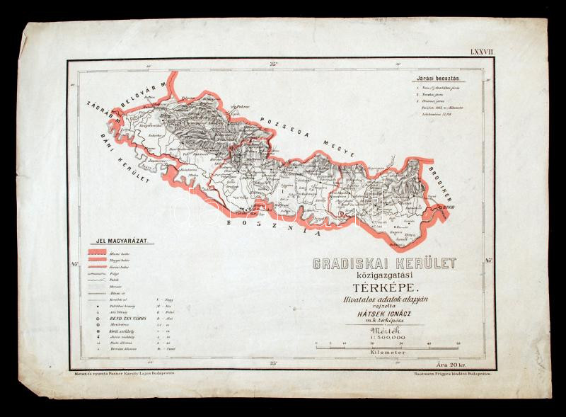 Leírás: cca 1880 Gradiskai kerület közigazgatási térképe, rajzolta Hátsek Ignác, 1:500000, 38x27 cm