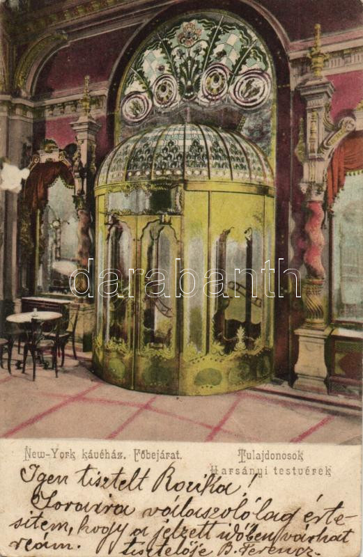 Leírás: Budapest VII. New York Kávéház főbejárata; Tulajdonosok a Harsányi Testvérek (fa)