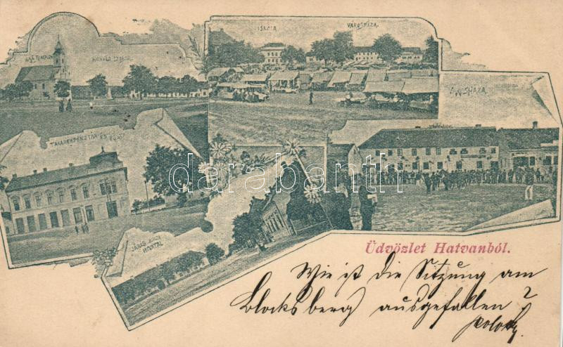 Leírás: Hatvan, Honvéd szobor, iskola, Városháza, Járási Bírói hivatal, Takarékpénztár és posta, floral, Art Nouveau (vágott / cut)