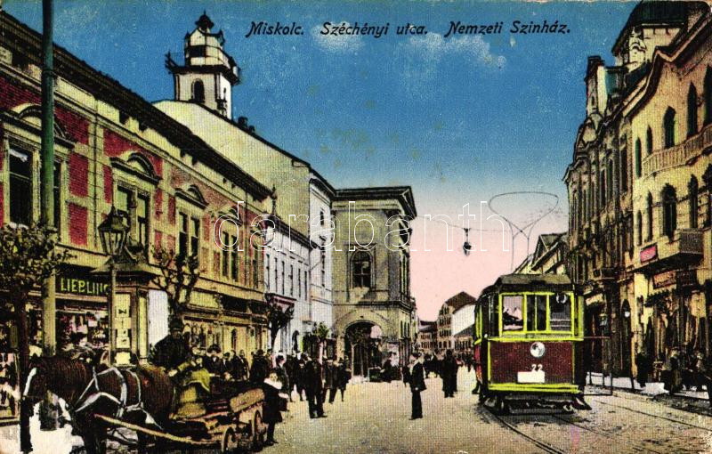 Miskolc, Széchenyi utca, színház, villamos, Grünwald Ignác kiadása https://www.darabanth.com/hu/237-Gyorsarveres/237.0/Kepeslapok/Magyarorszag~800366/Miskolc-Szechenyi-utca-szinhaz-villamos-Grunwald-Ignac-kiadasa~II1095228