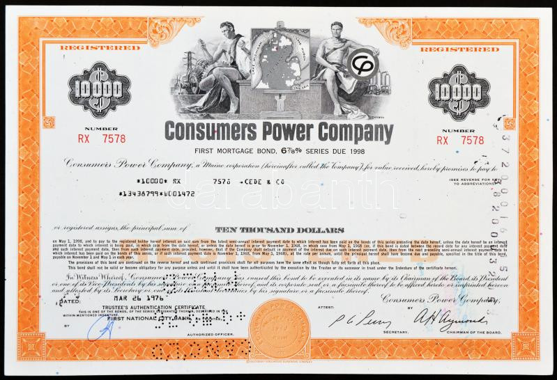Amerikai Egyesült Államok / Michigan 1976. "Consumers Power Company" részvénye 10.000$-ról, perforált, bélyegzésekkel T:I