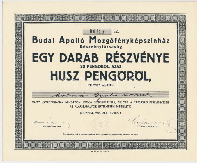 Leírás: Budapest 1941. "Budai Apolló Mozgófényképszínház Részvénytársaság" részvénye 20P-ről, szárazpecséttel T:I,I-