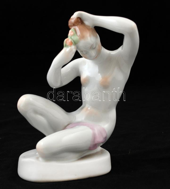 Leírás: Aquincumi porcelán fésülködő női akt, kézzel festett, jelzett, hibátlan, m:15 cm / Hand painted porcelain female nude
