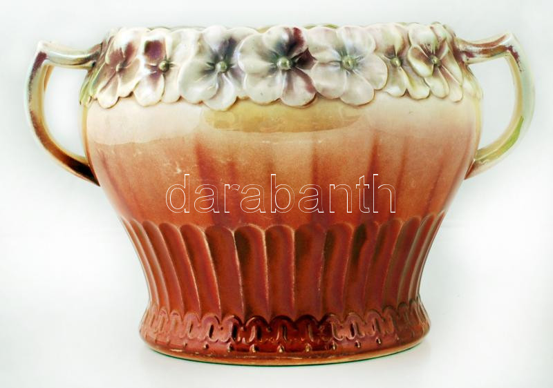 Leírás: Gyöngyházfényű, szecessziós német porcelán kupa, kézzel festett, jelzett, kis kopásnyomokkal, d: 24,5 cm, m: 24 cm
