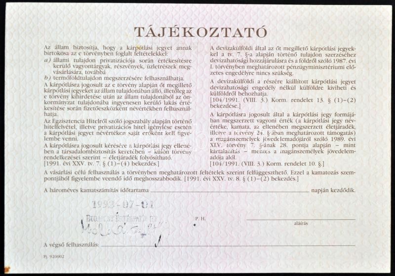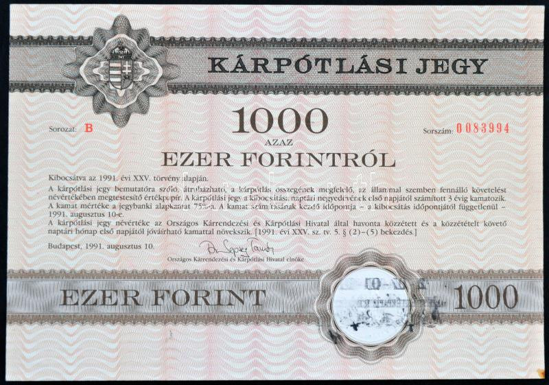 Leírás: Budapest 1991. "Országos Kárrendezési és Kárpótlási Hivatal" kárpótlási jegye 1000Ft-ról, "B" sorozat T:I-