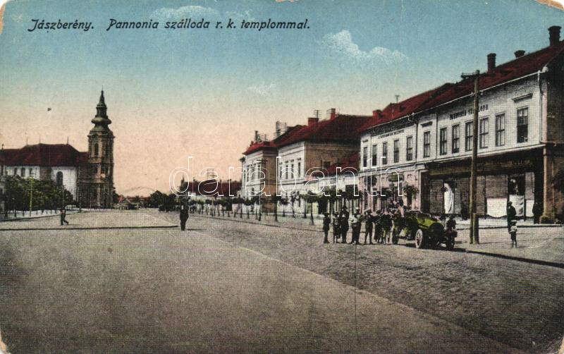 Leírás: Jászberény, Pannónia szálloda, Római katolikus templom, autó (fa)