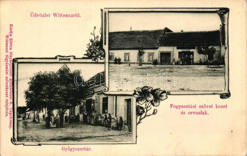 Leírás: Vittenc, Chtelnica; Fogyasztási szövetkezet, orvoslak, gyógyszertár; kiadja Elvira fényképészeti műintézete / cooperative, pharmacy and doctor's apartment