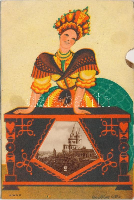 Budapest, szignós népviseletes mechanikus lap s: Mallász Gitta https://www.darabanth.com/hu/24-Nagyaukcio/24.1/Magyar-kepeslapok/Magyarorszag~9439/Budapest-szignos-nepviseletes-mechanikus-lap-s-Mallasz-Gitta~II1043374