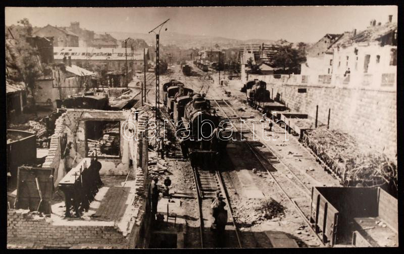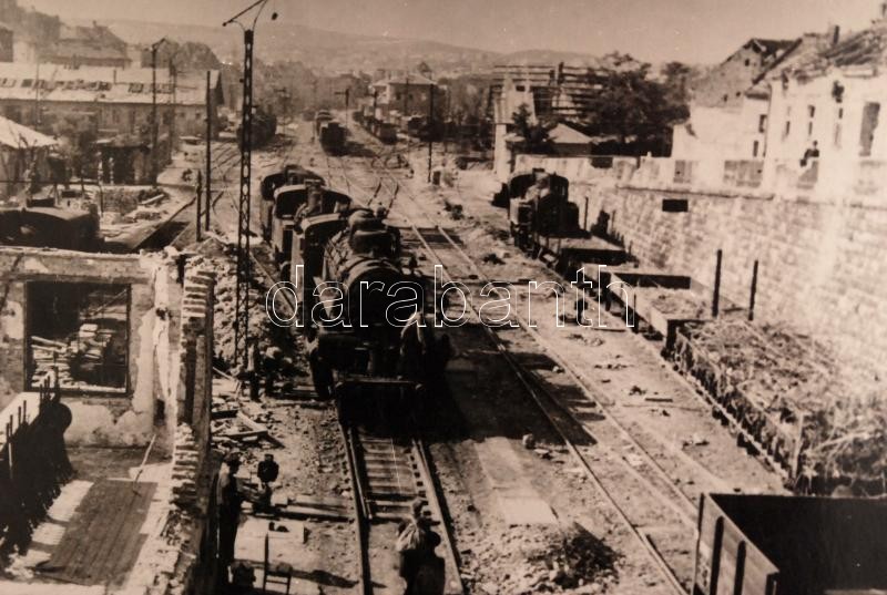 1945 A szétlőtt Déli pályaudvar és az Alkotás út. Bp. Székesfőváros Idegenforgalmi Hivatalának Fotólaboratóriuma pecséttel jelezve / 1945 The bombed Southern Railway station in Budapest 14x9 cm