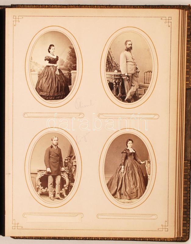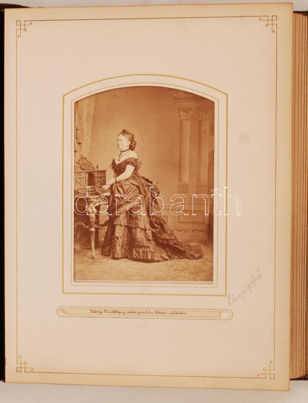 cca 1880 Nemes és főúri családok fényképeit tartalmazó fotóalbum. 113 fotó a Thiel, Deák, Lónyai, Bánhegyi családok családtagjairól. Mind szép állapotban, rézveretes bőr fotóalbumban, jó állapotban. Szinte minden fotó alatt névaláírásokkal. Szép és érdekes anyag / 113 photos of Hungarian noblemen and women in leather album.
