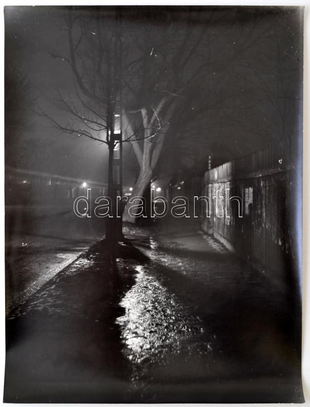 Leírás: cca 1935 Éjszaka Zuglóban, Kinszki Imre (1901-1945) hagyatékában levő vintage negatívról készült későbbi nagyítás, 40x30 cm