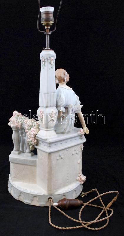 Antik figurális asztali lámpa, kézzel festett mázas fajansz, restaurált, formaszámmal (7972), márka jelzés nélkül, nem működik, m:48 cm (lámpatest)/ Antique faiance table lamp with lady figure, restaurated