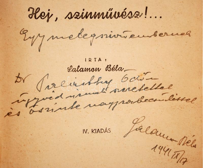 Salamon Béla: Hej színművész... Bp. 1939. Szerzői kiadás. Dedikált, el... https://www.darabanth.com/hu/24-Nagyaukcio/24.1/Mutargy-papirregiseg/Konyvek-Egyeb-ritkasagok~9338/Salamon-Bela-Hej-szinmuvesz-Bp-1939-Szerzoi-kiadas-Dedikalt-elso-kiadas-Rajzos-ki~II1275272