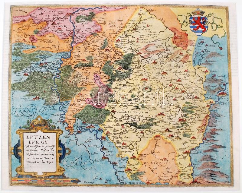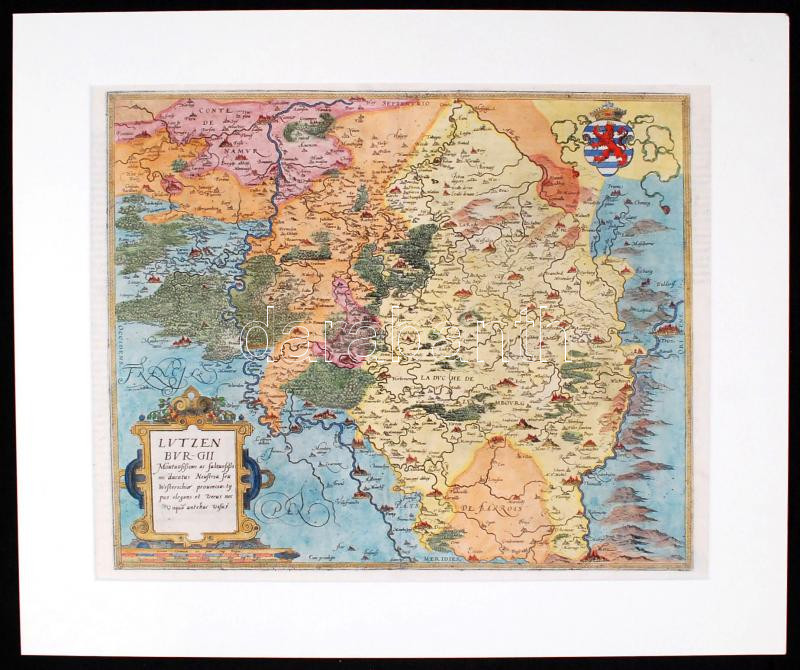1593 Lutzenburgii (Luxembourg) Gérard de Jode színezett rézmetszetes térképe Luxembourgról, a Speculum orbis terrarum (Antwerpen, 1593) c. munkából, hátulján Luxembourg rövid történetével latin nyelven, 49x39 cm. Paszpartuban /