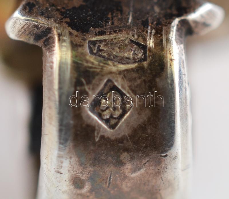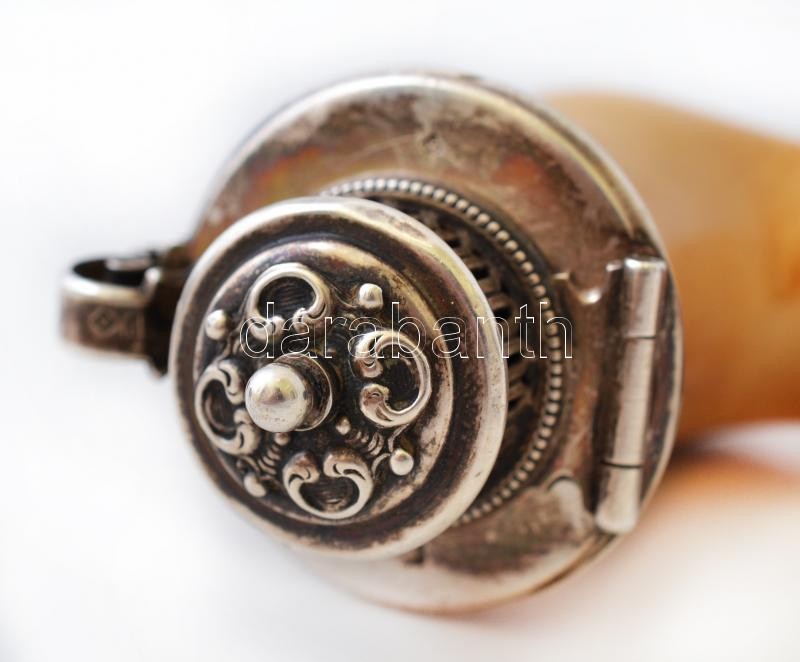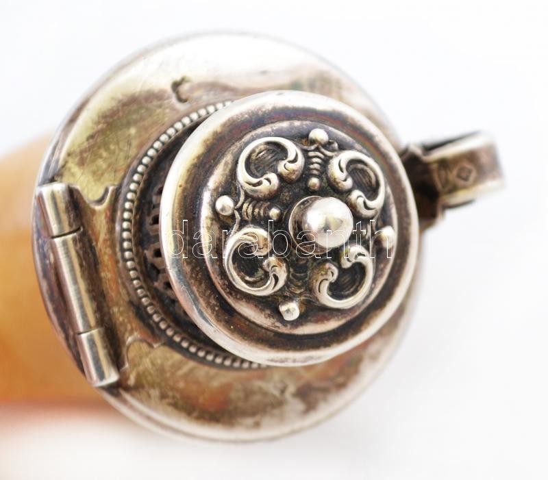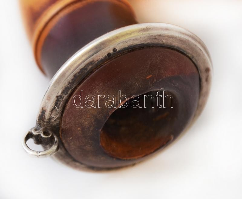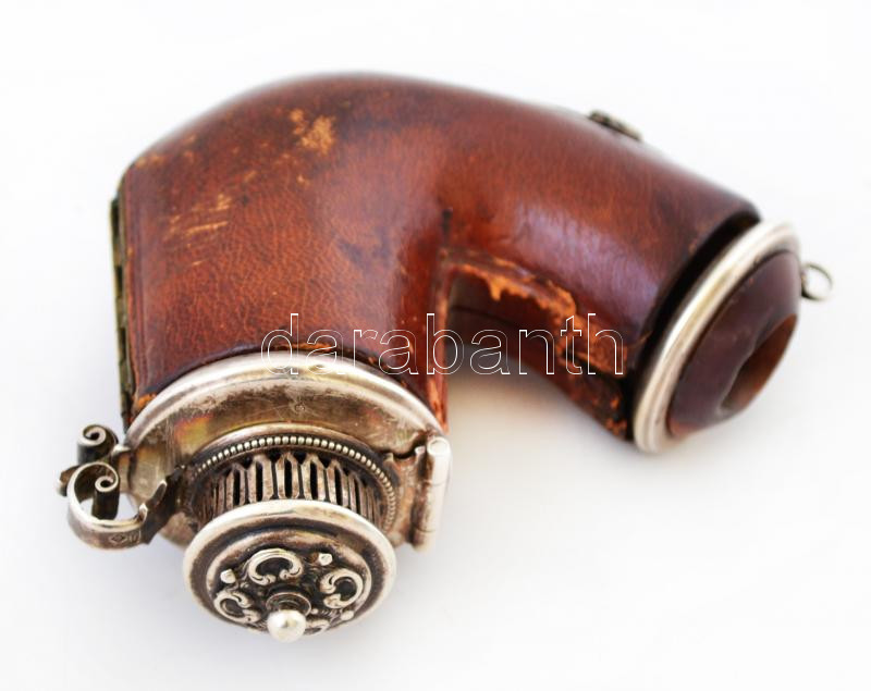XIX. sz. vége: Adler Fülöp és fia. Ezüst szerelékes, jelzett tajtékpipa, bőr tokkal, rajta, szerencsepatkót ábrázoló kapocs. Szép állapotban. / End of XIXth. century: Adler marked pipe with silver parts in leather box, with horseshoe button. 9x9 cm
