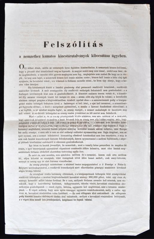 1848 Felszólítás a nemzethez kamatos kincstárutalványok kibocsátása ügyében. Kossuth Lajos pénzügyminiszter felhívása kölcsön jegyzésére az önálló magyar bankjegy megteremtése érdekében. 2 l. Buda, 1848. május 23. 40x24,5 cm.