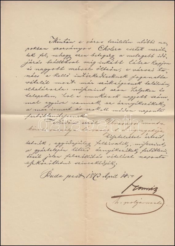 1873 Petrovits Szilárd (?-?) budapesti helyettes fÅ‘polgármester részben kézzel Ãrt levele a Közúti Vaspálya Társaság igazgatója részére a szórványos kolerafertÅ‘zéssel kapcsolatos egészségügyi intézkedések tárgyában, saját kezű aláÃrásával