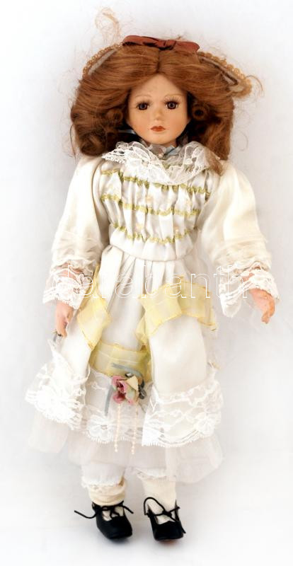Leírás: Festett porcelán fejű baba, jelzett (olvashatatlan), porcelán kezekkel és lábbal, menyasszonyi ruhában, kisebb hibákkal, m:45 cm