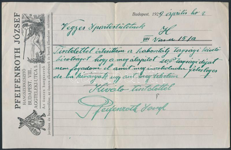 1929 Pfefenroth József Hangszerkészítő Budapest, számla, 22x14cm https://www.darabanth.com/hu/241-Gyorsarveres/241.0/Festmeny-mutargy-papirregiseg-egyeb/Okmanyok~900023/1929-Pfefenroth-Jozsef-Hangszerkeszito-Budapest-szamla-22x14cm~II1124796
