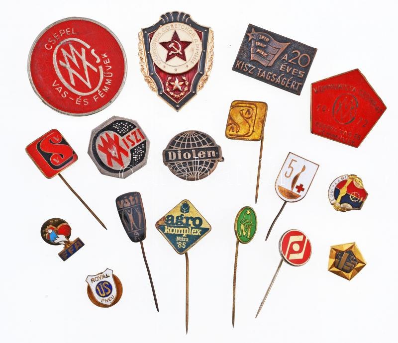 17db-os vegyes magyar és külföldi jelvény, kitűző, főleg a szocialista időszakból, közte 1972. "Kommunista Szombat - Csepel Vas- és Fémművek 1972" festett fém jelvény, DN "A 20 éves KISZ Tagságért" fém jelvény T:vegyes