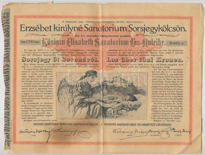 Budapest 1904. "Erzsébet királyné Sanatorium Sorsjegykölcsön" sorsjegy... https://www.darabanth.com/hu/241-Gyorsarveres/241.0/Numizmatika/Reszvenyek-es-sorsjegyek~5/Budapest-1904-Erzsebet-kiralyne-Sanatorium-Sorsjegykolcson-sorsjegye-5K-rol-szarazpecset~II1026292