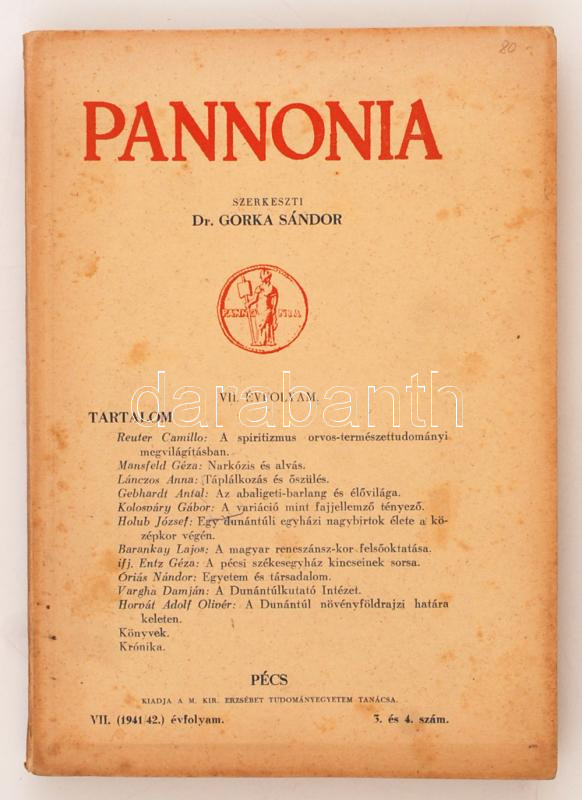 1941/1942 Pécs, A Pannonia című folyóirat VII. évfolyamának 3-4. száma... https://www.darabanth.com/hu/242-Gyorsarveres/242.0/Festmeny-mutargy-papirregiseg-egyeb/Nyomtatvanyok~200007/19411942-Pecs-A-Pannonia-cimu-folyoirat-VII-evfolyamanak-3-4-szama-Dr-Gorka-Sandor-sze~II1054494