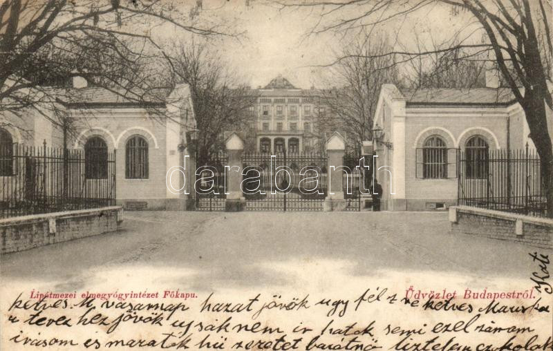Leírás: Budapest II. Lipótmezei elmegyógyintézet főkapuja; kiadja Kofron Miklós (EK)