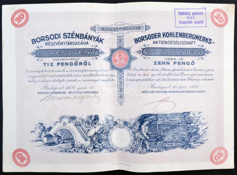 Leírás: Budapest 1926. "Borsodi Szénbányák Részvénytársaság" 10 részvénye egyenként 10P-ről szelvényekkel, felülbélyegzéssel T:II,II-