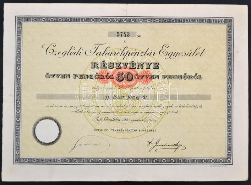 Leírás: Czegléd 1928. "Czeglédi Takarékpénztár Egyesület" részvénye 50P-ről, szelvényekkel és szárazpecséttel T:III