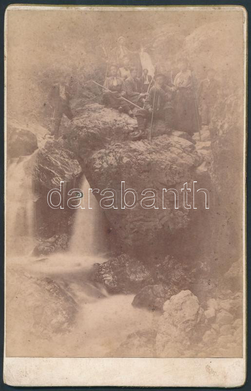 Leírás: cca 1890 Turisták pihenője a vízesésnél, keményhátú fotó, 16x10 cm