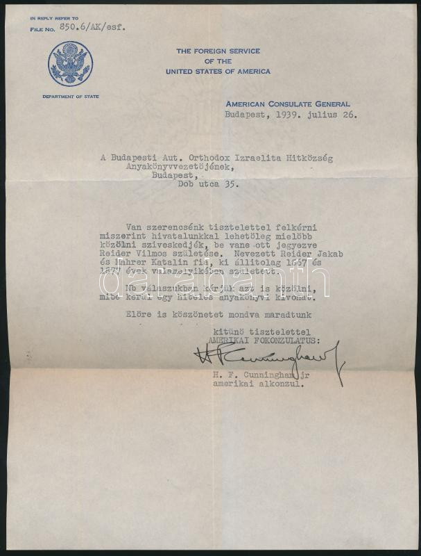 1939 Bp., Az Amerikai Konzulátus levele a Budapesti Aut. Orthodox Izraelita Hitközség Anyakönyvvezetőjének személy azonosításának és hiteles anyakönyv kiállításának ügyében