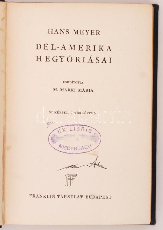 Meyer, Hans: Dél-Amerika hegyóriásai. Bp., é. n., Franklin Társulat. Díszes, aranyozott gerincű vászonkötésben, az első lap kijár, egyébként jó állapotban.